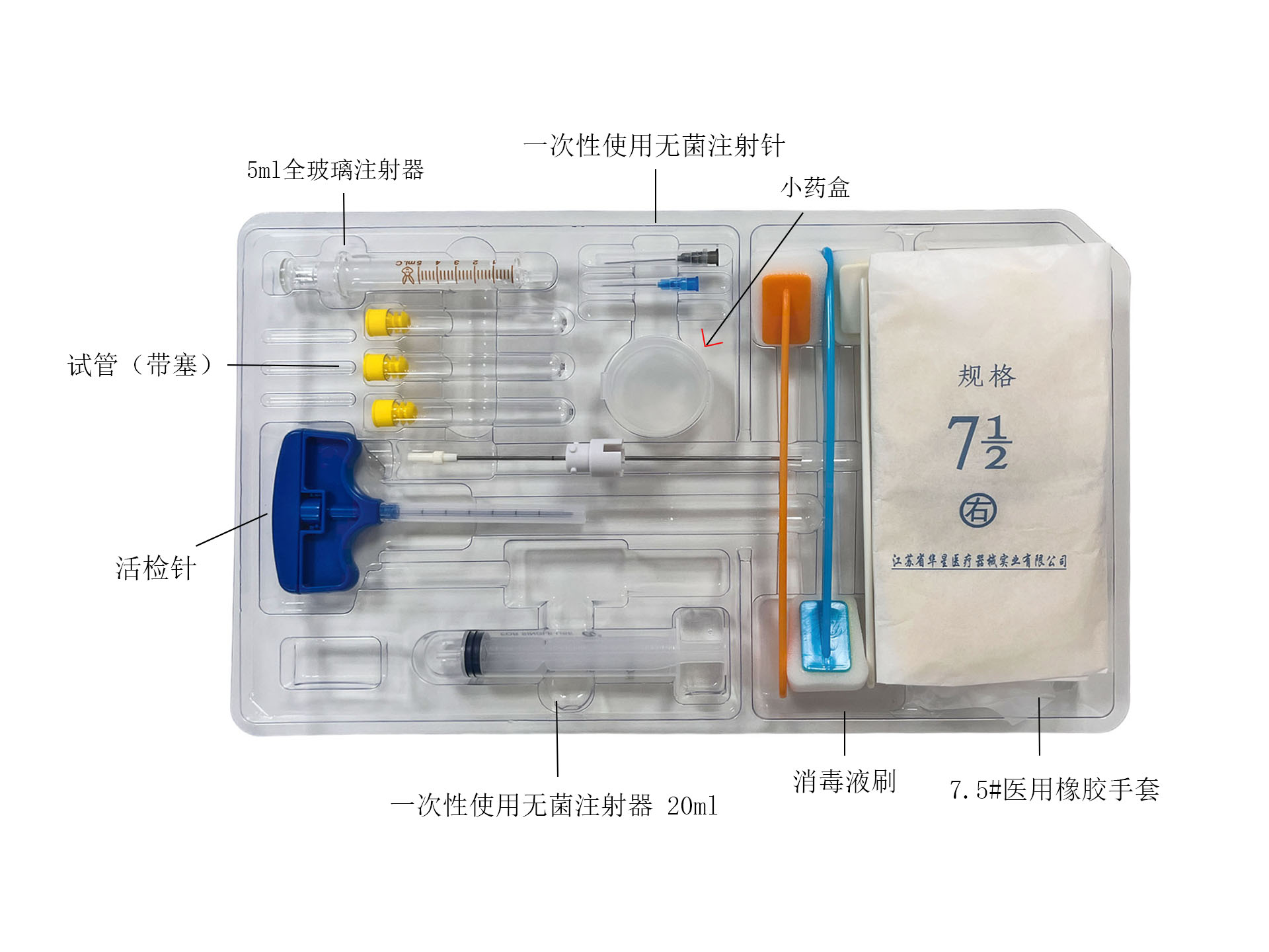 一次性使用骨髓穿刺活检针及套件基本配置由一次性使用骨髓穿刺针-抽吸式、一次性使用骨髓穿刺针-活检式、一次性使用骨髓穿刺针-小儿式、取样管、接柱组成。选用配置由橡胶医用手套、全玻璃注射器、一次性使用无菌注射器、一次性使用无菌注射针、塑料镊子、试管(带塞)、脱脂纱布叠片、棉球、胶带/胶贴、载玻片、通针、手术巾(洞巾)、敷料巾(包布)、消毒液刷、换药盒、器械盘组成。产品按不同的配置分为A型、B型、C型、D型,按穿刺针的型式分为抽吸式、活检式、小儿式。产品经环氧乙烷灭菌,为一次性使用。