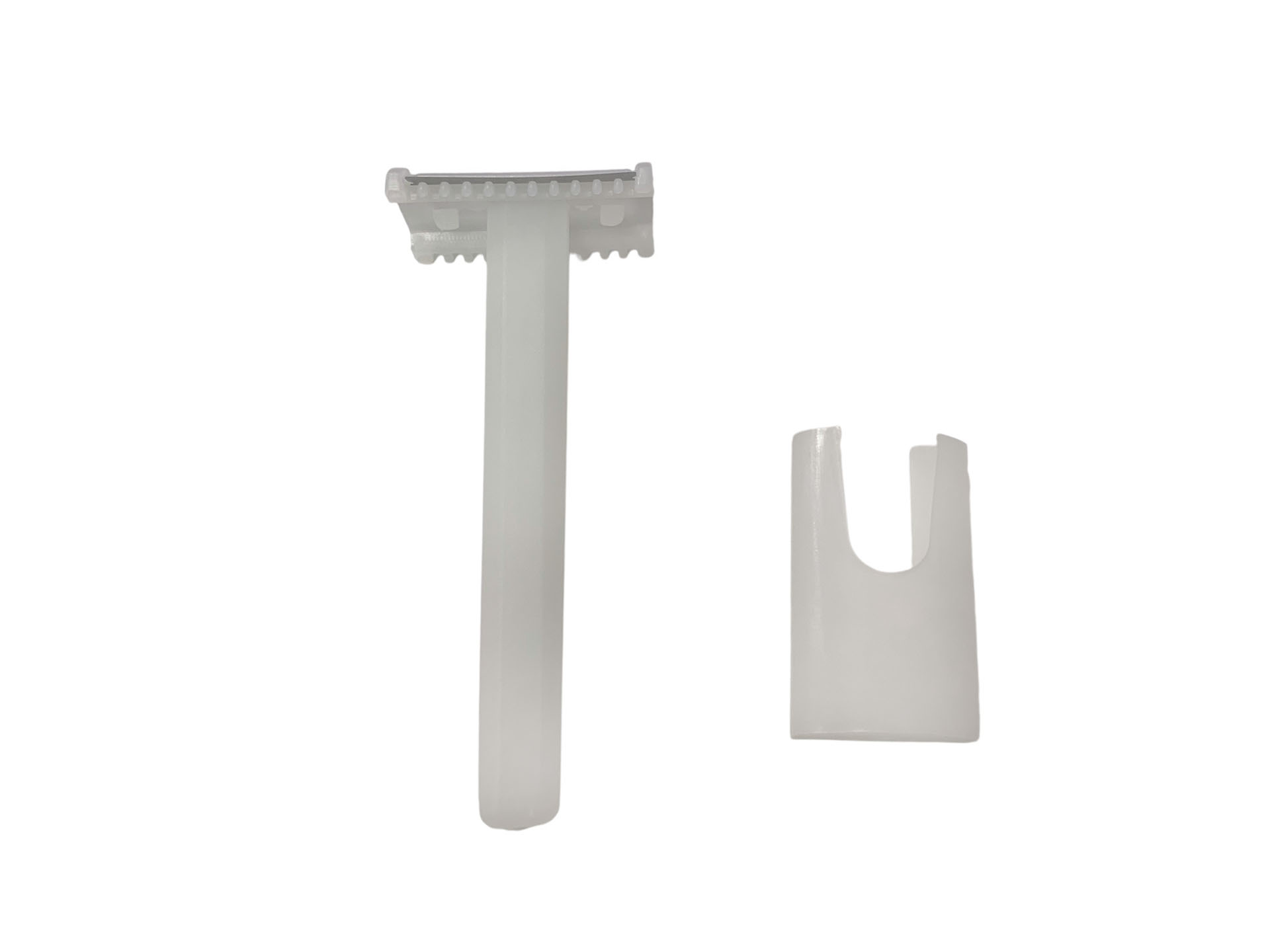 一次性使用备皮刀由护盖、盖片、刀片、刀柄组成。备皮刀的刀片采用符合QB/T 1105-1991的双面刀片制成,刀柄、护盖、盖片采用聚丙烯材料制成。产品经环氧乙烷灭菌,无菌。