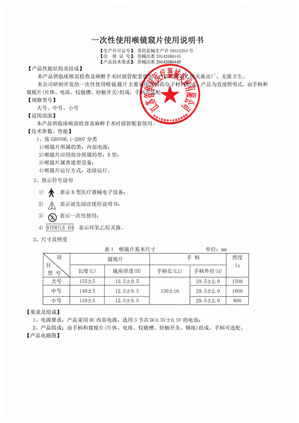 一次性使用喉镜窥片是一种医疗产品,主要用于检查和观察患者的喉部情况。 该产品采用高质量材料制成,具有良好的耐用性和抗菌性能,确保患者的安全和舒适。 喉镜片按型式分为:L、M、S。...